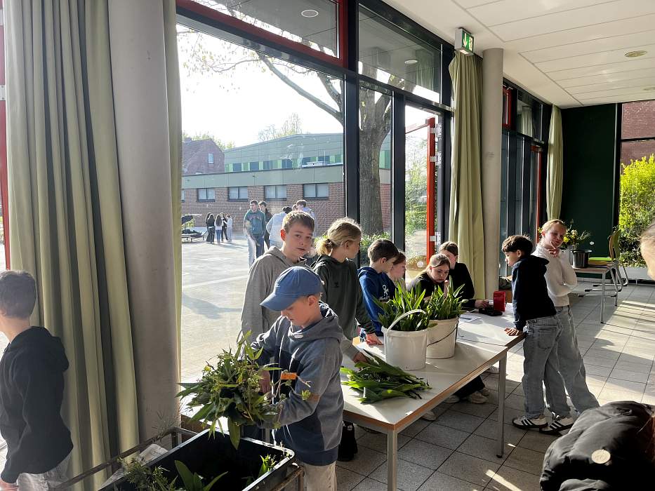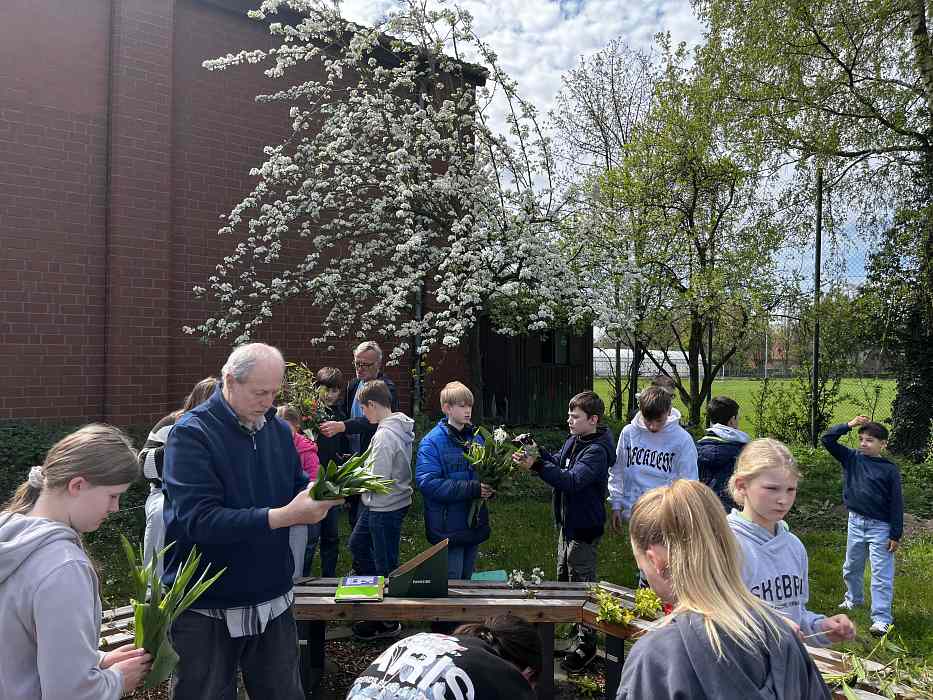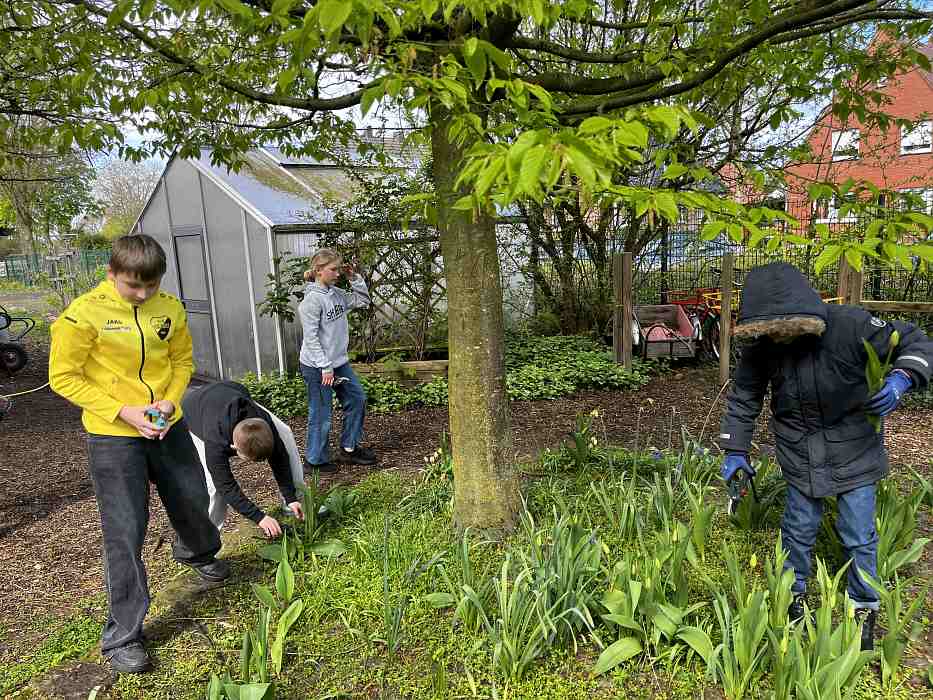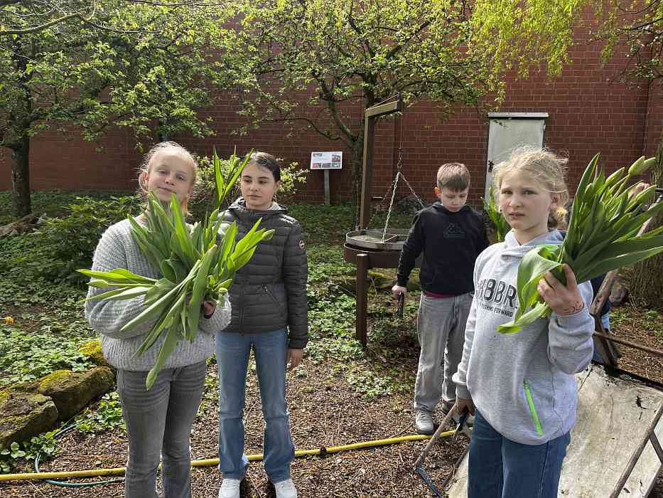 Die Grundlage dafür wurde bereits im vergangenen Herbst gelegt: Gemeinsam pflanzten die Schülerinnen und Schüler die Tulpenzwiebeln. Mitte April konnten die Tulpen schließlich geschnitten und für 0,80 € pro Stück verkauft werden. Auch einige gebundene Sträuße konnten verkauft werden.