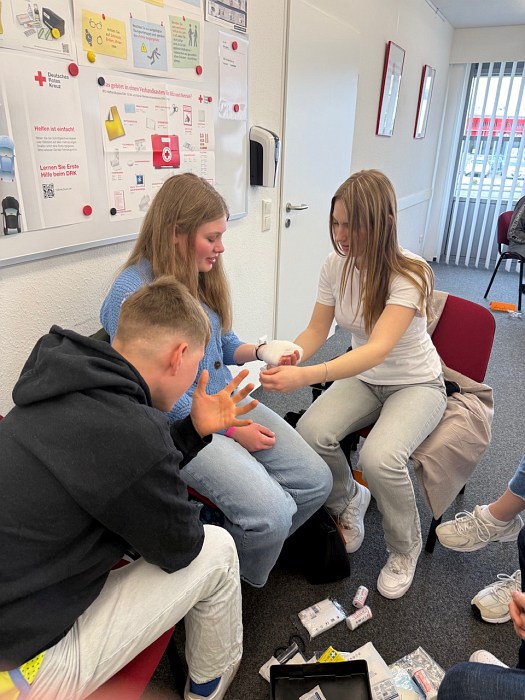 Am frühen Samstagmorgen machten sich drei Schülerinnen und Schüler der LWS Glandorf auf den Weg, um an einem Erste-Hilfe-Kurs des Deutschen Roten Kreuzes in Osnabrück teilzunehmen. Unter der Leitung von Frau Honerkamp wurden sie umfangreich auf ihre Aufgaben als angehende Schulsanitäter*innen vorbereitet.