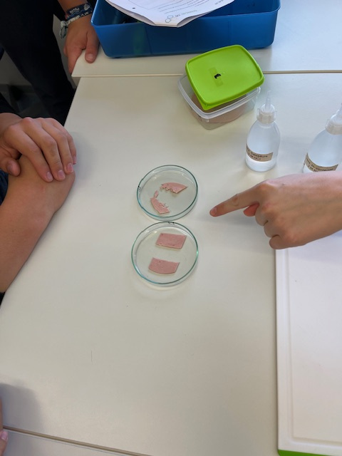 Zwei verschiedene Wurstprodukte sollten untersucht werden, eine vegane Variante und eine aus Schweinefleisch. Zunächst sammelte die Klasse Kriterien, wie sie die Wurstproben unterscheiden könnten.