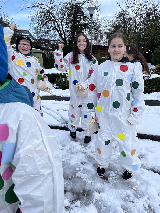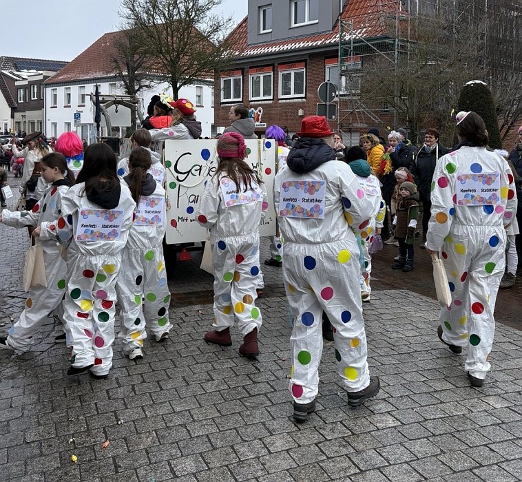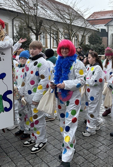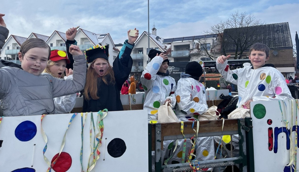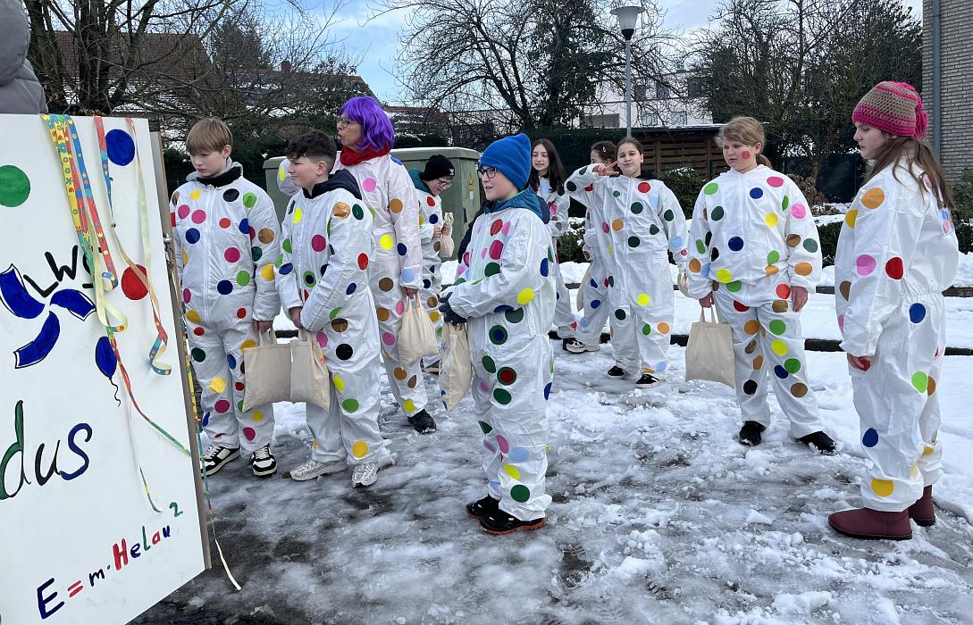 Die leuchtenden Konfettipunkte auf dem Wagen und den Kostümen der Teilnehmenden boten einen fröhlichen Kontrast zum schmuddeligen Schneewetter und luden zum Feiern ein. Denn allen Grund zum Feiern hatte die Luwi: Die Ergebnisse vom Bildungstrend der IQB- Studie für die Fächer Mathematik und Naturwissenschaften fielen für die Schule besonders gut aus und waren ein guter Grund für unser diesjährige Motto. Die zahlreichen Schaulustigen am Rand freuten sich über den bunten Bonbonregen der LuWis und die Tatsache dass das Wetter bis zum Schluss hielt.